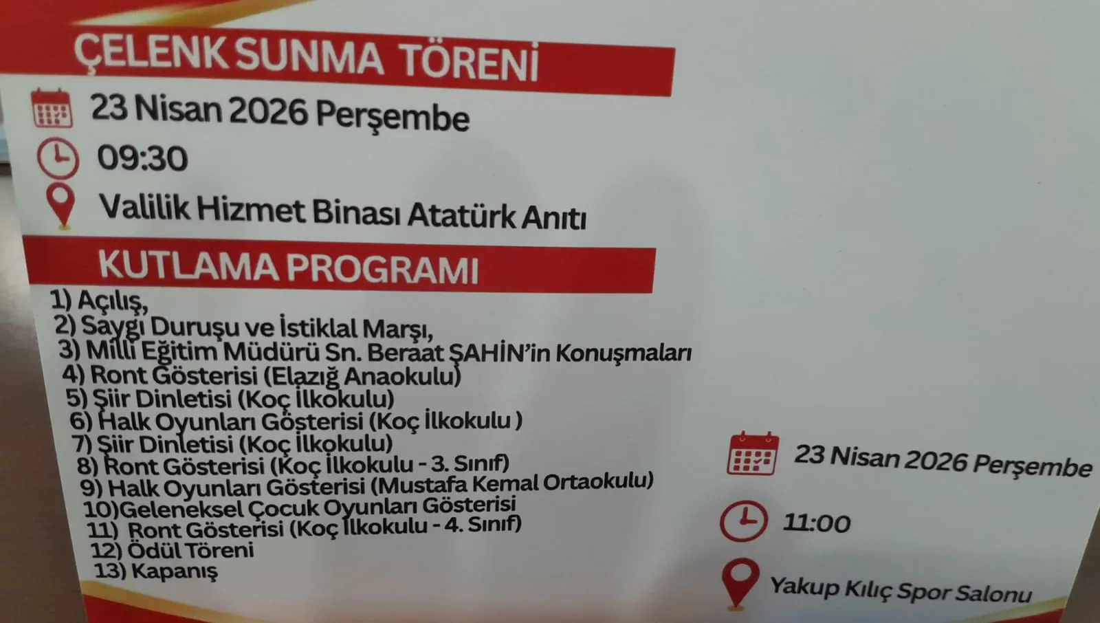 23 Nisan 2026 Perşembe 09:30 Valilik Hizmet Binası Atatürk Anıtı KUTLAMA PROGRAMI