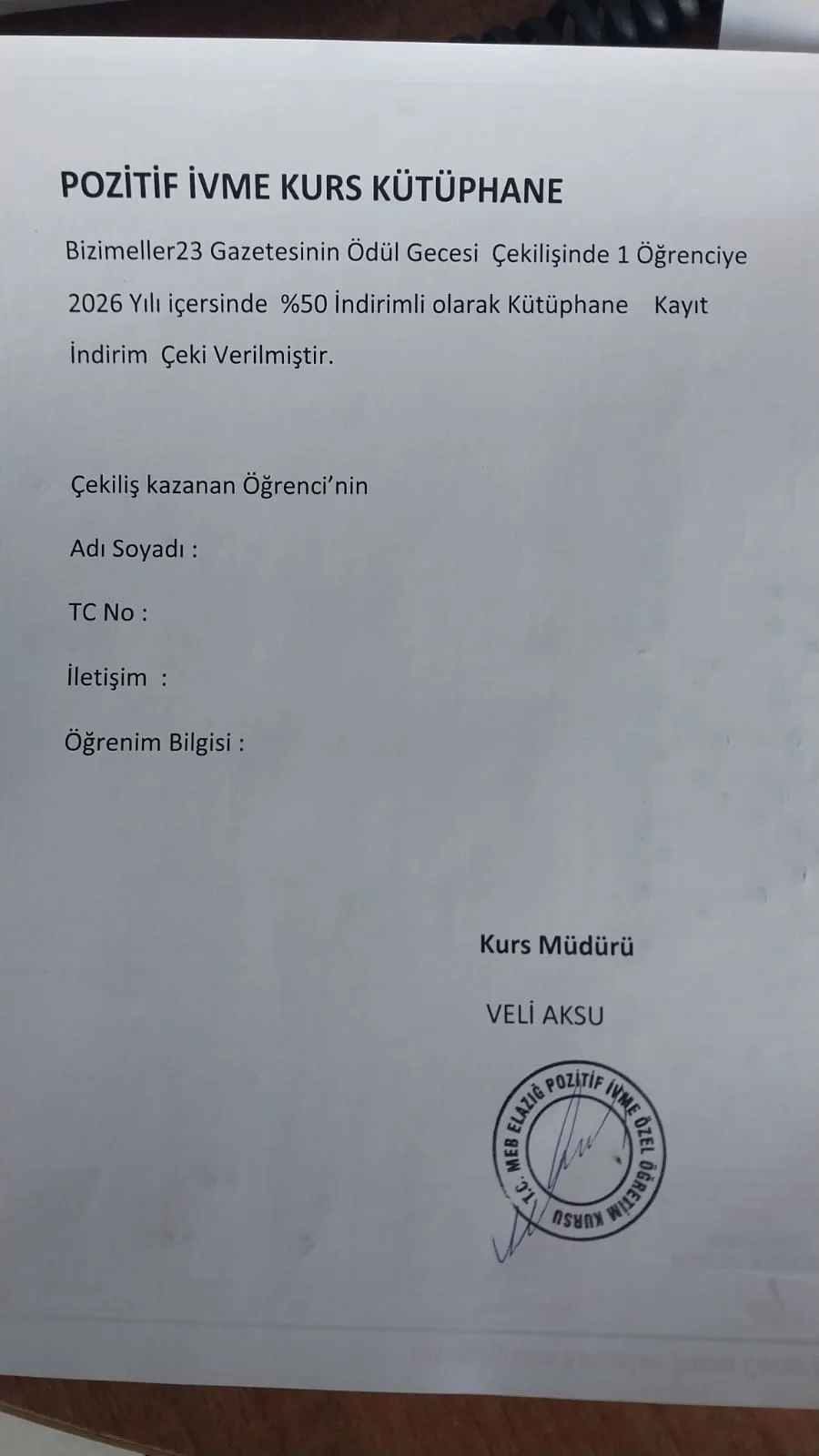 Hediyeler arasında 11 talihli kişiye Elazığspor duvar saati ve Elazığspor maç bileti, 5 talihli kişiye Ofisim Büro Mobilyadan bilgisayar koltuğu olacaktır. 2 talihli kişiye ilave eğitim için Pozitif İvme kursundan %50 oranında indirim çeki verilecektir.ayrica 5 talihli kisiye koçoglu yoresel resturantda %50 indirimli yemek çeki verilmiştir. Tüm katkı sağlayan bu şehir esnafına teşekkür ederiz.