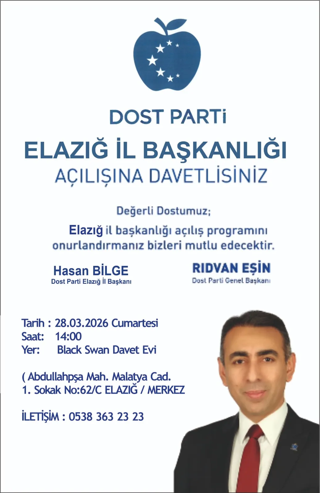 Tüm hızıyla sahada çalışmalarını sürdüren DOST parti Elazığ İl Başkanlığı binasının açılışı 28 Mart Cumartesi günü gerçekleştiriliyor.