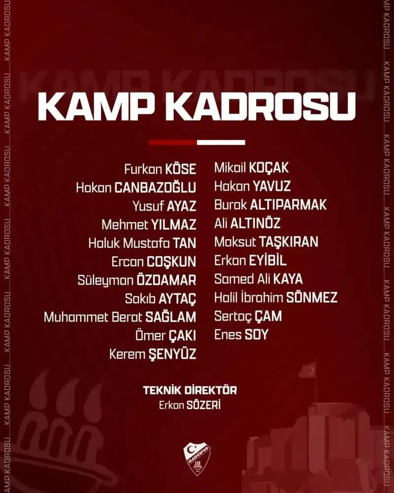 Nesine 2. Lig Play-Off 1. Tur ilk maçında perşembe günü Adana 01 FK ile deplasmanda karşılaşacak olan Seza Çimento Elazığspor, 21 futbolcuyla Adana’ya gitti. Teknik Direktör Erkan Sözeri’nin 21 kişilik maç kadrosunda sakatlıkları devam eden Fuat Bavuk ile Çağlayan Menderes yer almadı.