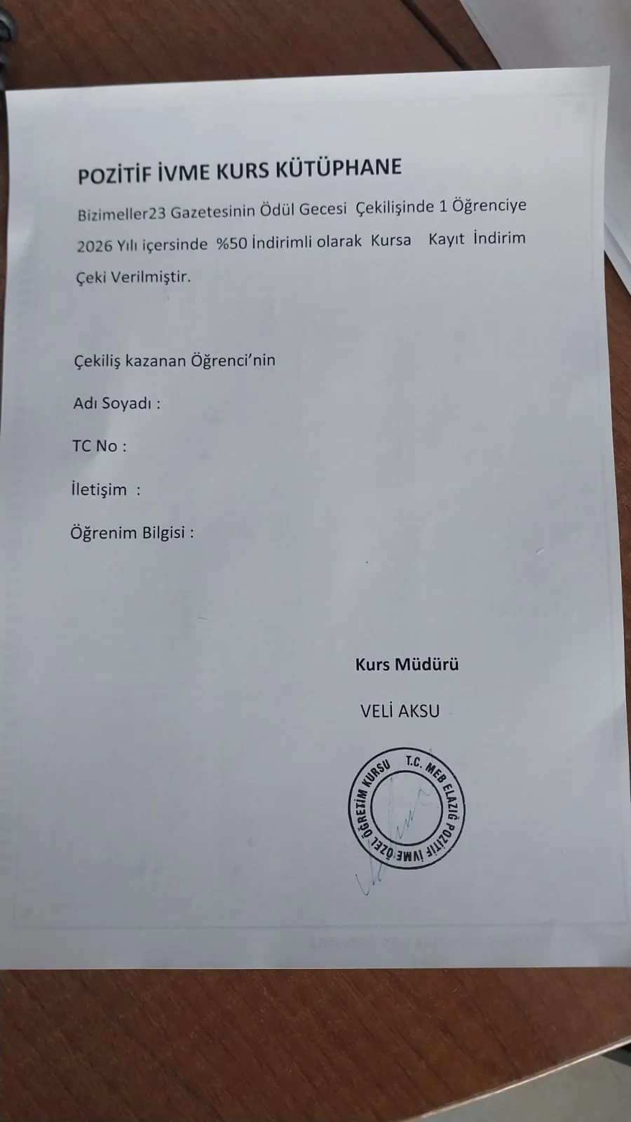 Hediyeler arasında 11 talihli kişiye Elazığspor duvar saati ve Elazığspor maç bileti, 5 talihli kişiye Ofisim Büro Mobilyadan bilgisayar koltuğu olacaktır. 2 talihli kişiye ilave eğitim için Pozitif İvme kursundan %50 oranında indirim çeki verilecektir.ayrica 5 talihli kisiye koçoglu yoresel resturantda %50 indirimli yemek çeki verilmiştir. Tüm katkı sağlayan bu şehir esnafına teşekkür ederiz.