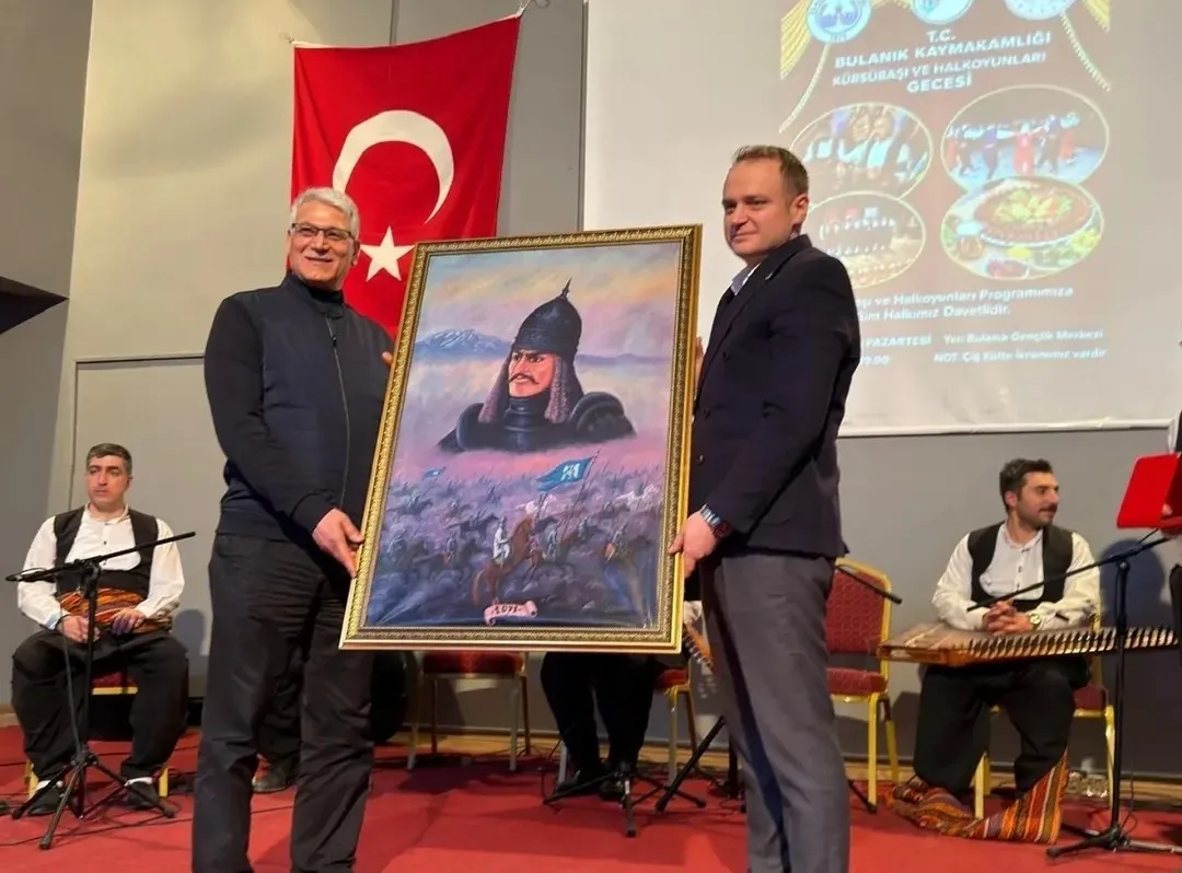 Elazığ Belediyesi Kültür, Sanat ve Sosyal İşler Müdürü Mehmet Karaaslan’a plaket takdim eden Kaymakam Ömer Övünç Koşansu, Elazığ Belediye Başkanı Şahin Şerifoğulları’na iletilmek üzere Sultan Alparslan temalı yağlı boya tablosu hediye etti.