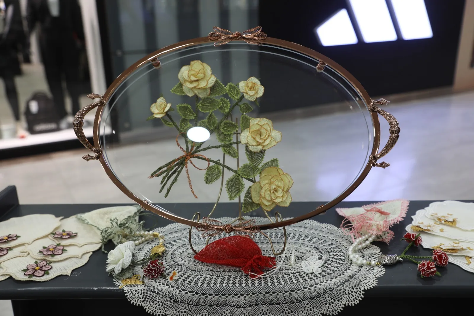 Sergide, kursiyerlerin “Boncuklu İğne Oyası” motifiyle hazırladıkları yaka iğneleri, tepsi, başörtüler, duvak, gelin çiçeği, gelin tacı, takılar, kahve sunum peçeteleri ve tespih başlığı gibi birbirinden kıymetli eserler sergilendi.