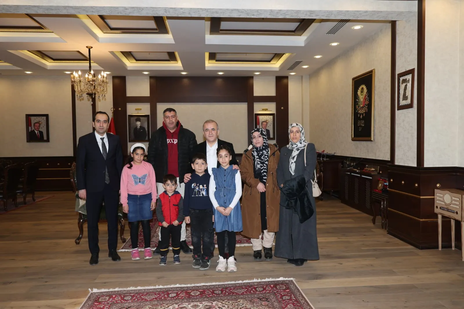 Şanlı bayrağımızın yere düştüğünü gören ve hemen müdahale ederek bayrağımızı yerden kaldıran 7 yaşındaki Azad TATLIDİLLİ ile 9 yaşındaki Özge GENÇ isimli çocukları makamında ağırladı.